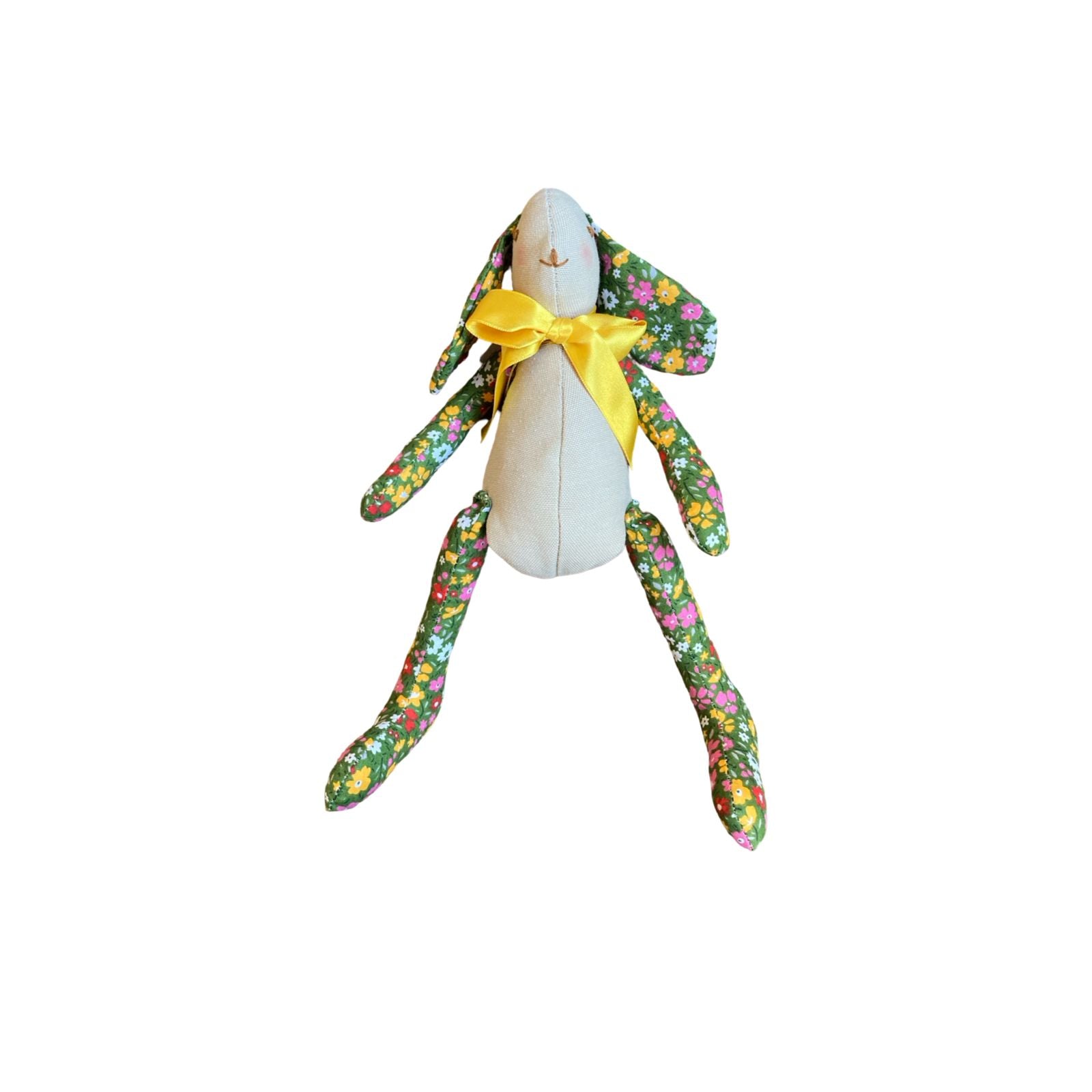 Morbido with Floral Pattern: The product is 28 cm long. It consists of 5 pieces filled with fiber. The head and body are made of a linen blend fabric. The arms, legs, and ears are designed with colorful floral patterned fabric. It can be washed at 30 degrees. It has a yellow ribbon accessory around its neck.