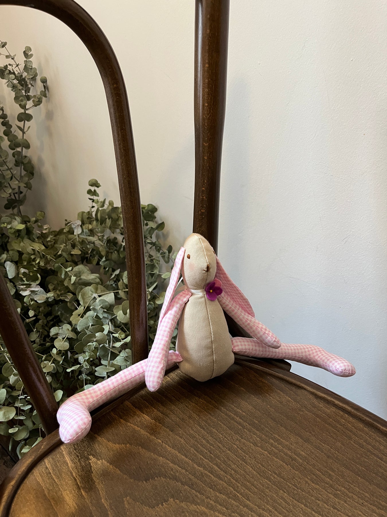Pink Gingham Morbido: The product is 29 cm. It consists of 5 pieces filled with fiber. The head and body are made of linen blend fabric. The arms, legs, and ears are designed with pink gingham fabric. It can be machine washed at 30 degrees. It has a felt flower detail accessory around the neck.