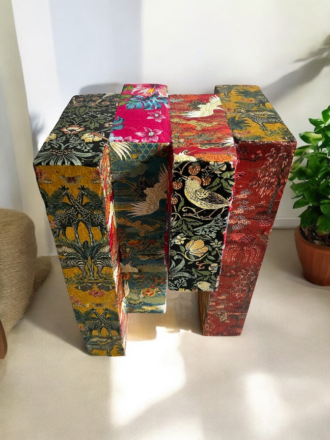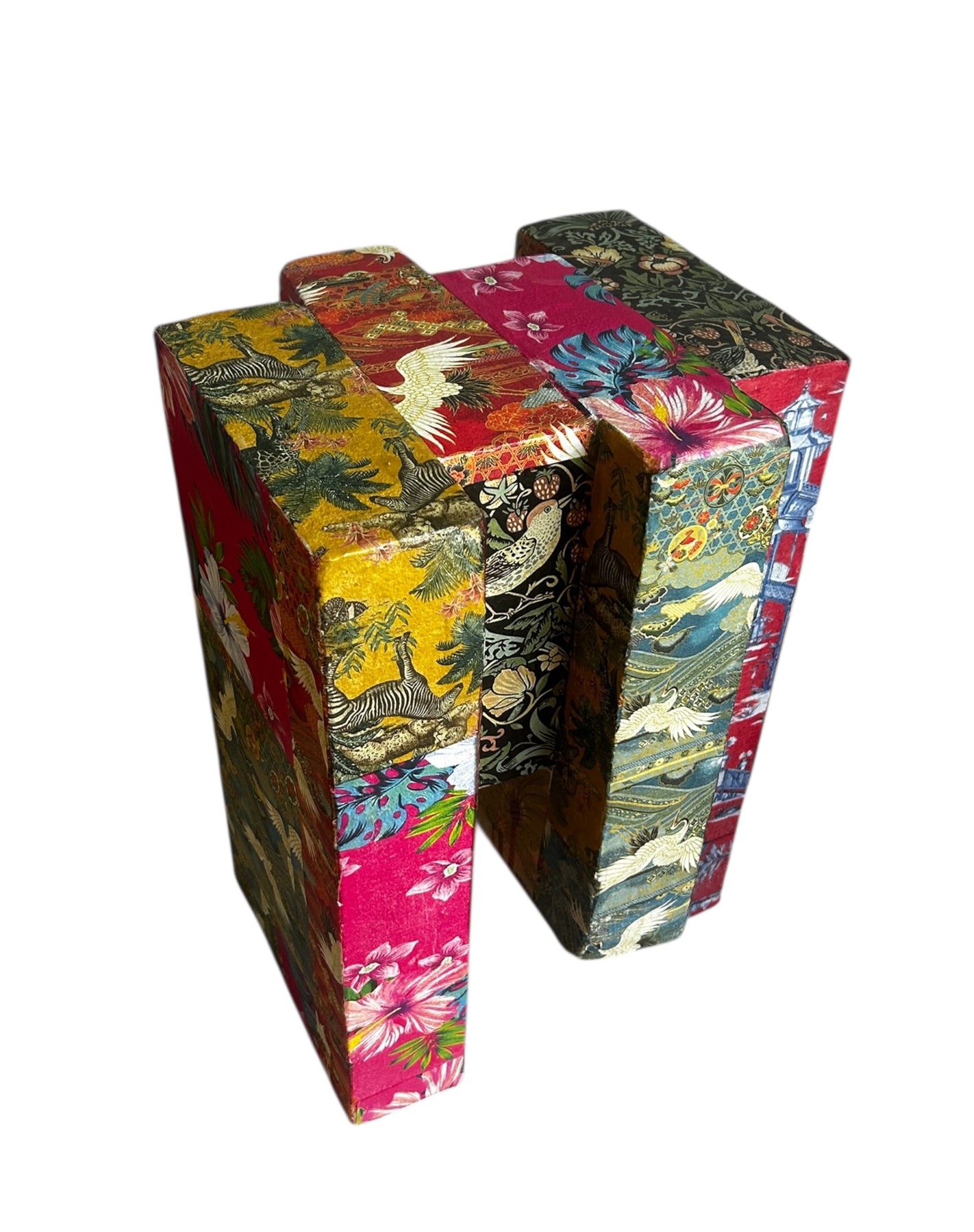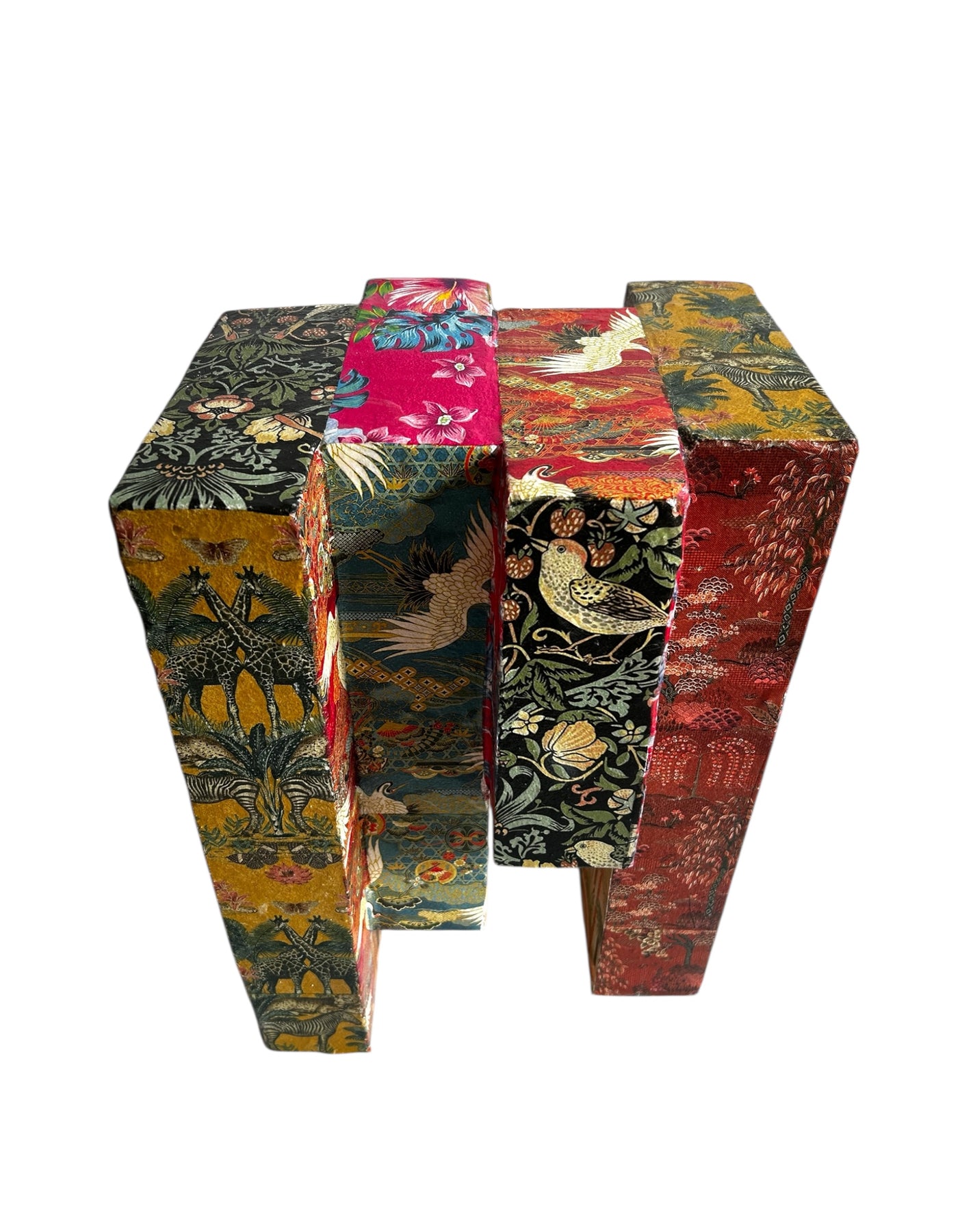 Özel olarak tasarlanan bu sehpa, beton bir taban üzerine seramik kil ile kaplanmış olup, üzerinde baskı motifi yer almaktadır.