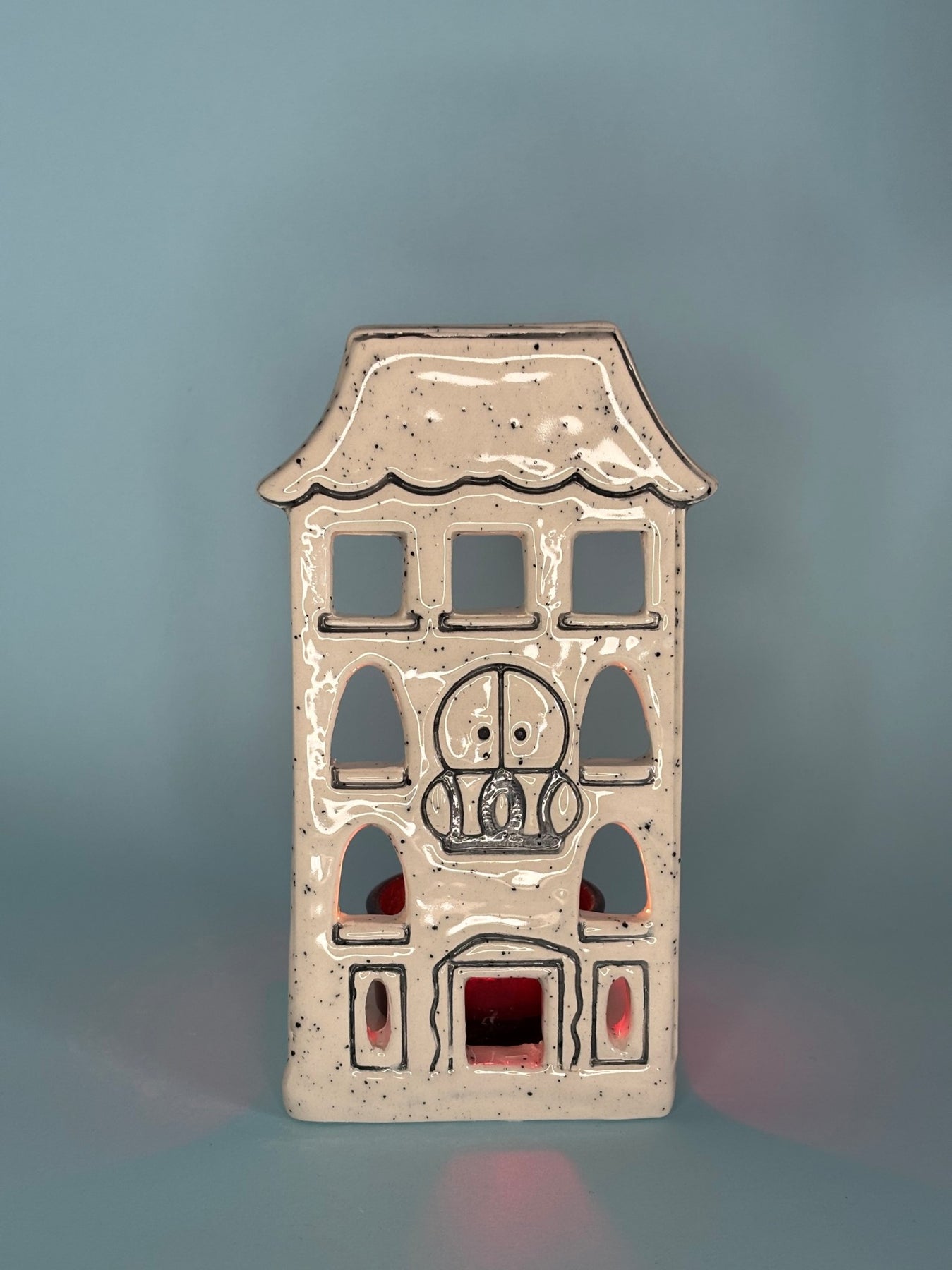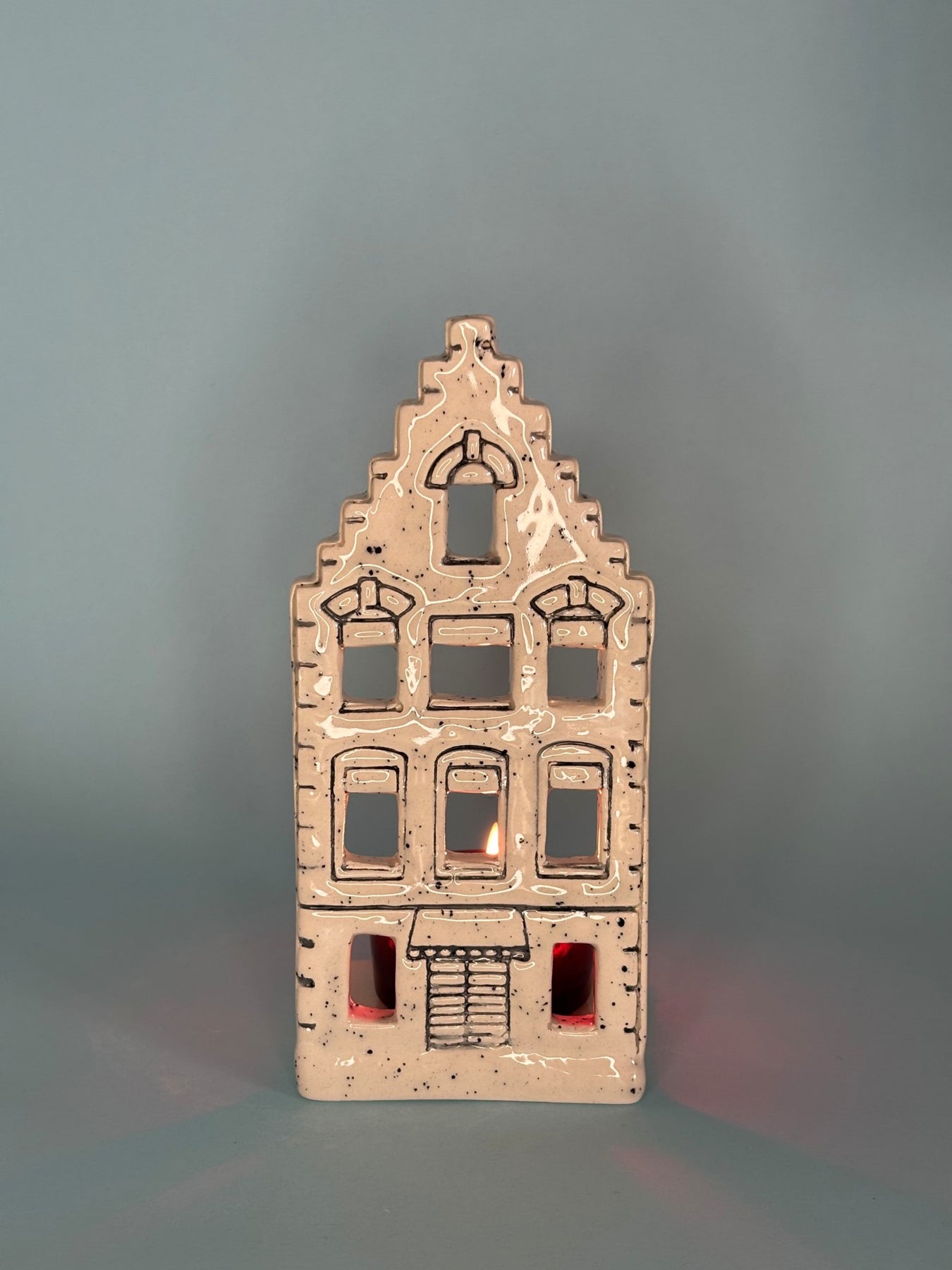 The handmade ceramic Amsterdam House Candle Holder is a special decorative piece inspired by the city's famous canal-side houses. With its slender windows, tall body, and vintage architecture, it brings the warm and charming street atmosphere of Amsterdam into your home. The tealight candle you place inside will emit a soft light out through the windows, creating a nostalgic and peaceful atmosphere. It's a timeless design that can be used both during the Christmas season and throughout the year. Features