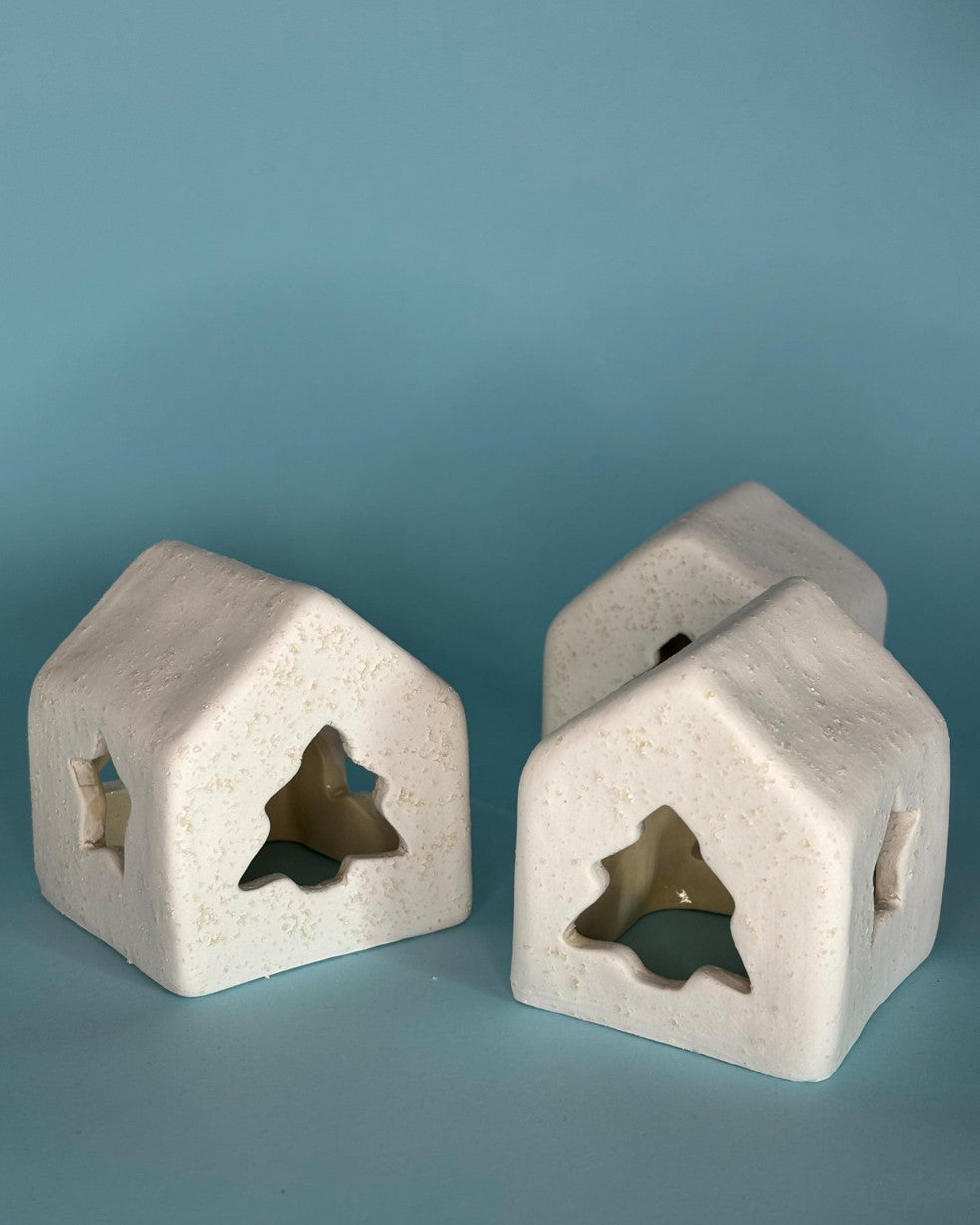 Reflecting the warm atmosphere of the New Year, this handmade ceramic Christmas House emits a soft light at night with a tealight candle placed inside.